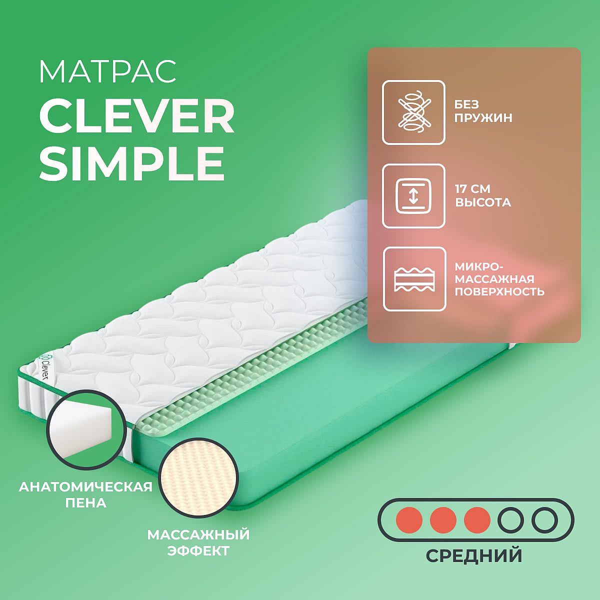 Матрас «Clever Simple» — средней жесткости, которая комфортна большинству людей среднего телосложения. Это — универсальный выбор и детям, и взрослым, и пожилым людям.