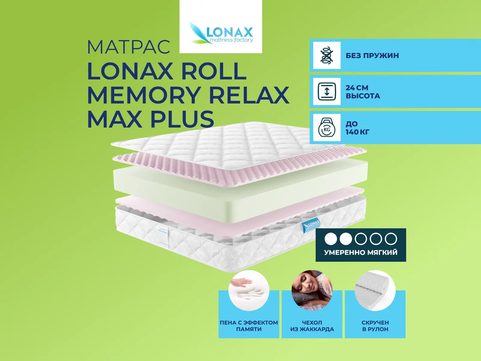 Средне-мягкий матрас «Lonax Roll Memory Relax Max Plus» — для настоящего ценителя комфорта. Такая модель отлично подойдет людям с небольшим весом.