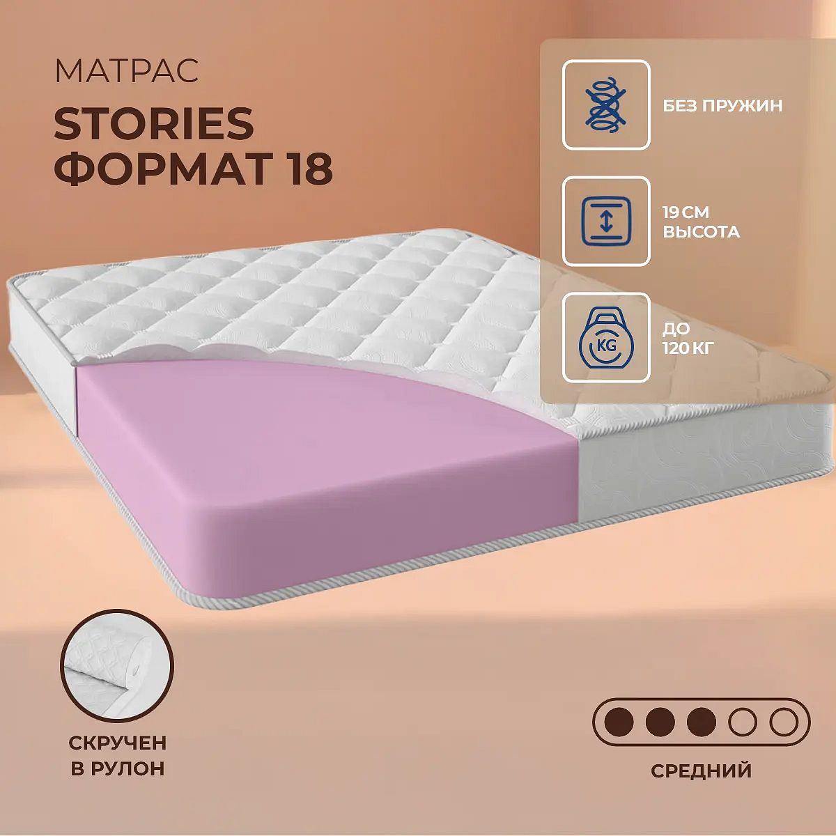 Матрас Stories Формат 18 — это беспружинный матрас средней жёсткости для комфортного и спокойного сна. Подходит для тех, кто предпочитает умеренную поддержку и ценит практичность в повседневном использовании. Высота 19 см обеспечивает удобную посадку на кровати, а плотный слой ППУ (пенополиуретан) толщиной 18 см равномерно распределяет нагрузку и поддерживает форму матраса. Чехол выполнен из хлопкового жаккарда, простёганного на холконе, что делает поверхность матраса приятной на ощупь и добавляет дополнительный комфорт при касании. Матрас рассчитан на максимальную нагрузку до 120 кг на одно спальное место, что делает его универсальным решением для большинства пользователей. Ключевые особенности