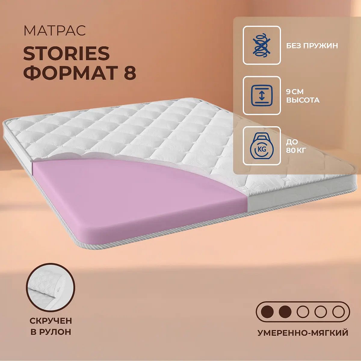 Матрас Stories Формат 8 из коллекции Компакт — беспружинная модель с умеренно мягкой поддержкой для комфортного сна. Благодаря высоте 9 см и наполнителю из современного пенополиуретана (ППУ) матрас подходит для спального места с максимальной нагрузкой до 80 кг. Такая конструкция обеспечивает мягкое прилегание и равномерное распределение веса, что особенно актуально для людей с небольшим и средним весом, а также для ежедневного использования на диване или в качестве дополнительного спального места. Несъёмный чехол выполнен из прочного жаккарда, простёганного на слое холкона плотностью 200 г. Это придаёт поверхности приятную мягкость и аккуратный внешний вид, а сам жаккард хорошо сохраняет форму и способствует циркуляции воздуха внутри матраса. Ключевые особенности